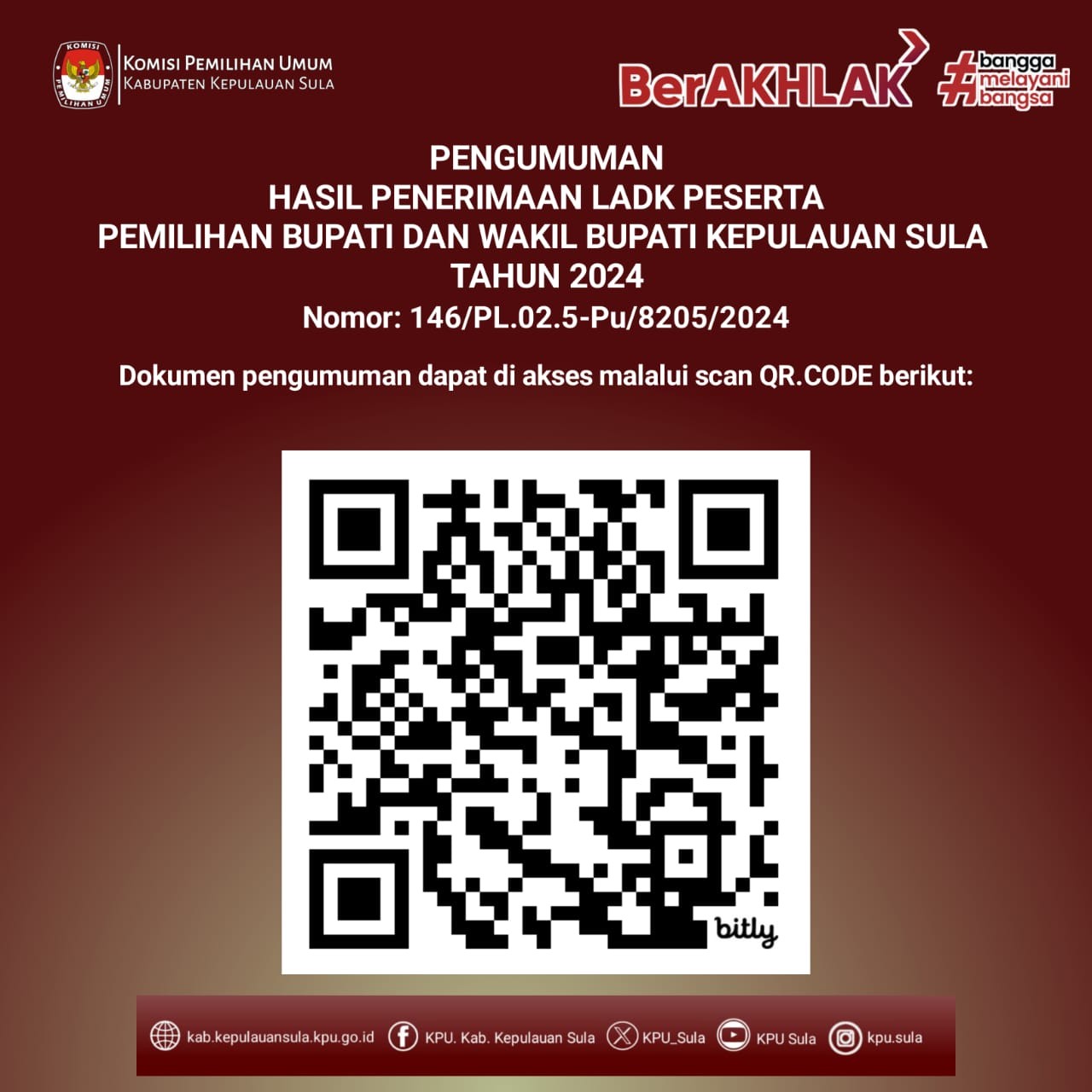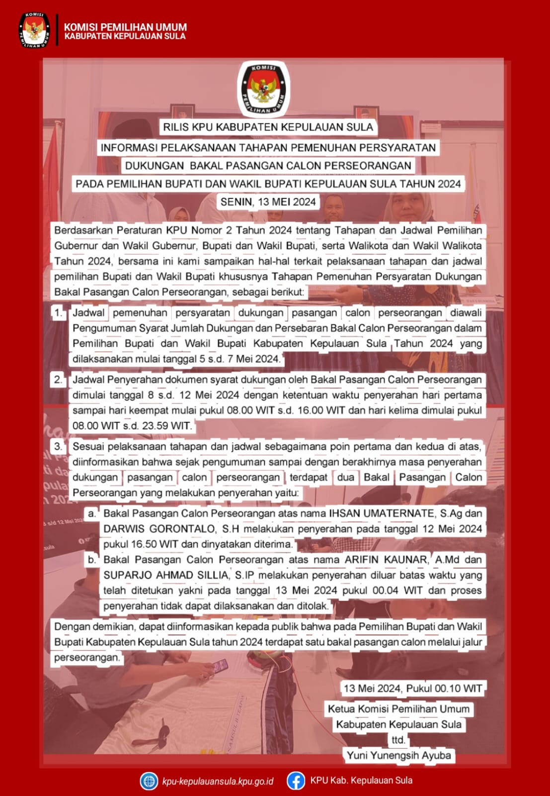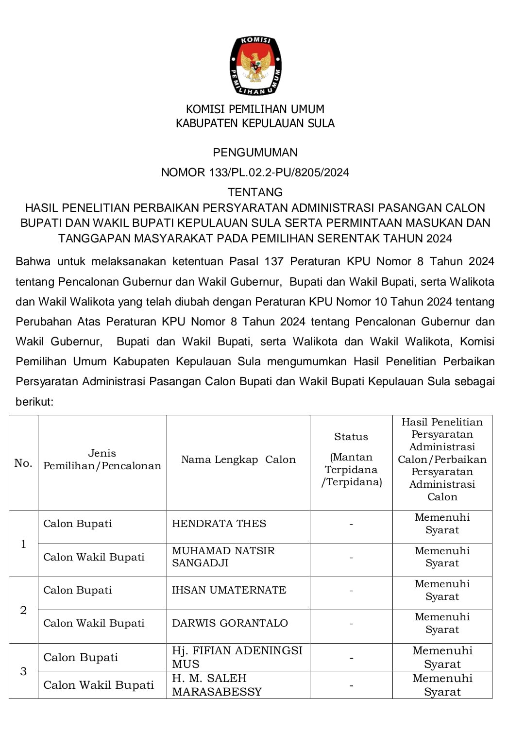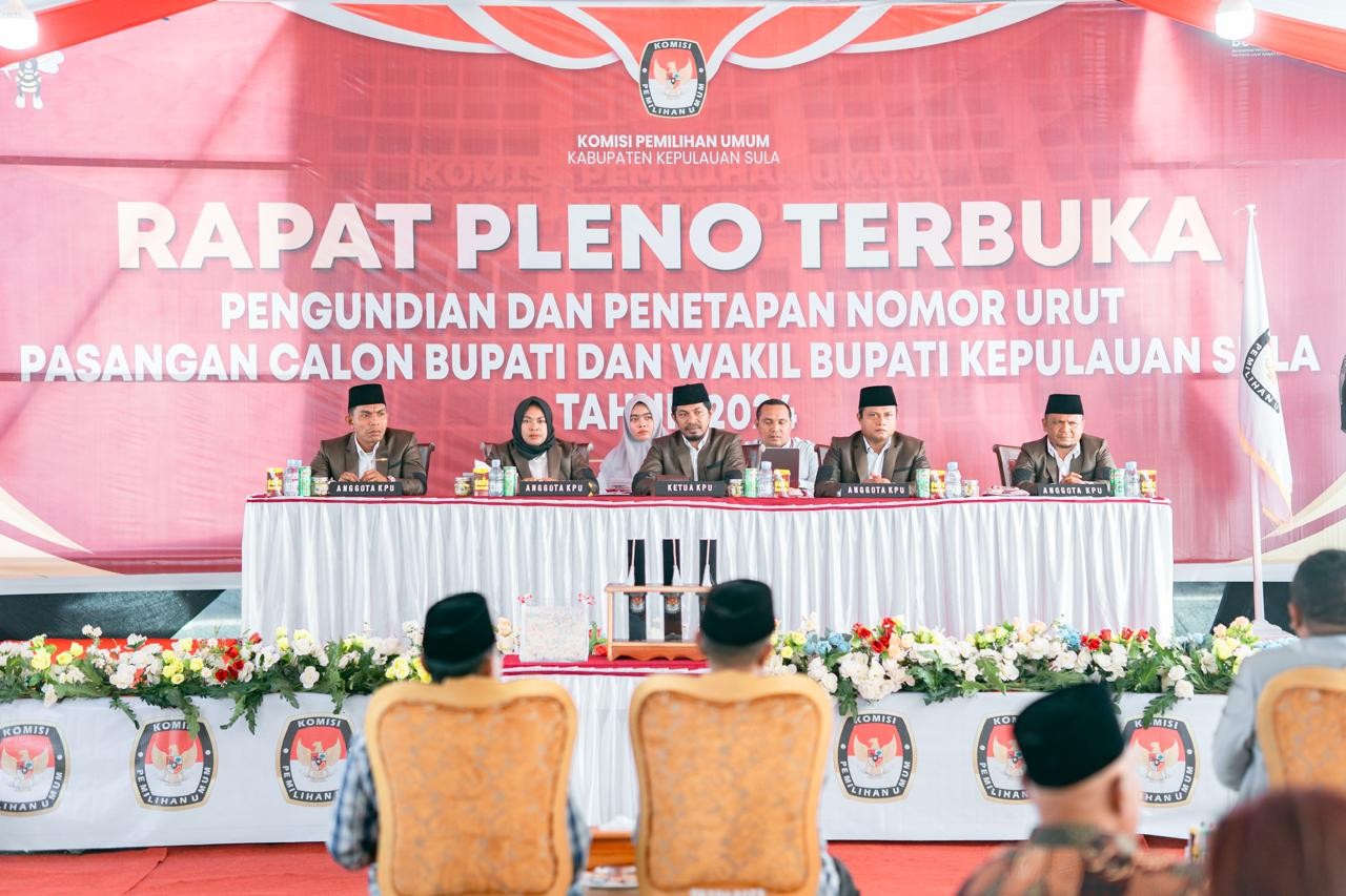 #TemanPemilih, KPU Kabupaten Kepulauan Sula telah menetapkan nomor urut Pasangan Calon Bupati dan Wakil Bupati peserta Pemilihan Tahun 2024, Senin (23/9/2024). Pengundian dan Penetapan nomor urut dihadiri oleh masing-masing Pasangan Calon, Partai Politik Pengusul dan Tim Pendukung masing-masing 50 orang serta undangan Forum Komunikasi Pimpinan Daerah Kabupaten Kepulauan Sula. Bahwa untuk melaksanakan ketentuan Pasal 122 ayat (2) Peraturan KPU Nomor 8 Tahun 2024 tentang Pencalonan Gubernur dan Wakil Gubernur, Bupati dan Wakil Bupati, serta Walikota dan Wakil Walikota yang telah diubah dengan Peraturan KPU Nomor 10 Tahun 2024 tentang Perubahan Atas Peraturan KPU Nomor 8 Tahun 2024 tentang Pencalonan Gubernur dan Wakil Gubernur, Bupati dan Wakil Bupati, serta Walikota dan Wakil Walikota, dan Keputusan Komisi Pemilihan Umum Kabupaten Kepulauan Sula Nomor 204 Tahun 2024 tentang Penetapan Pasangan Calon Bupati dan Wakil Bupati Kepulauan Sula Dalam Pemilihan Tahun 2024, Komisi Pemilihan Umum Kabupaten Kepulauan Sula mengumumkan Hasil Penetapan Nomor Urut Pasangan Calon Bupati dan Wakil Bupati Kepulauan Sula dalam Pemilihan Tahun 2024. Hasil undian yang telah ditetapkan oleh KPU Kabupaten Kepulauan Sula, Nomor Urut 1 atas nama Ihsan Umaternate, S.Ag dan Darwis Gorantalo, S.H. yang merupakan pasangan calon perseorangan. Nomor Urut 2 Hj. Fifian Adeningsi Mus, S.H. dan Ir. H.M. Saleh Marasabessy, M.Si yang diusulkan Partai Politik PDIP, Partai Hanura, PKS, PKB, Partai Golkar, PBB, PPP, dan Partai Gerindra. Nomor Urut atas nama Pasangan Calon Hendrata Thes, S.Pd.K dan Muhamad Natsir Sangadji, S.H. yang diusulkan Partai Politik PAN, Partai Perindo, PSI, Partai Demokrat, Partai NasDem, dan Partai Buruh. Dokumen pengumuman dapat di download disini: PENGUMUMAN PENETAPAN NOMOR URUT PASLON SULA 2024