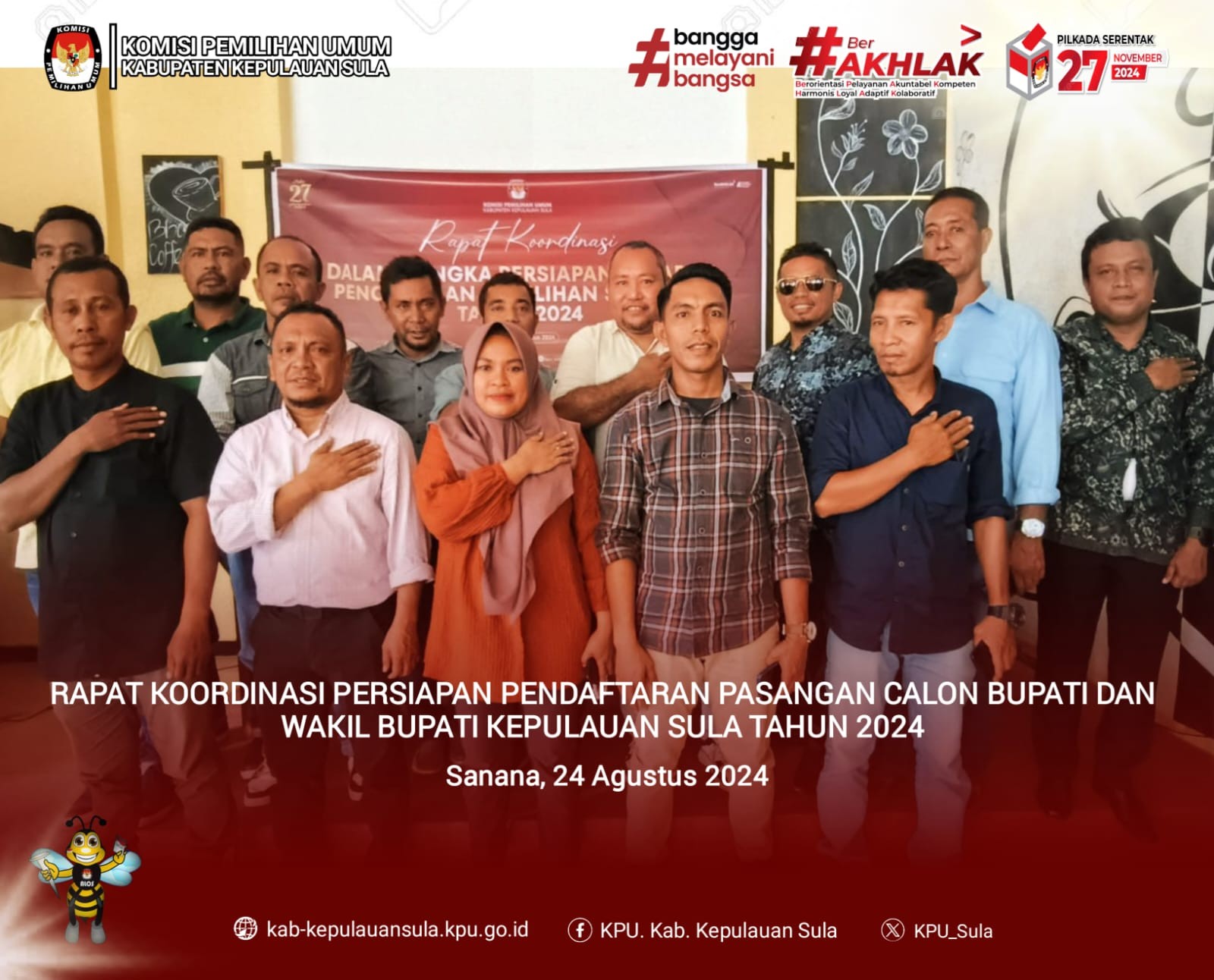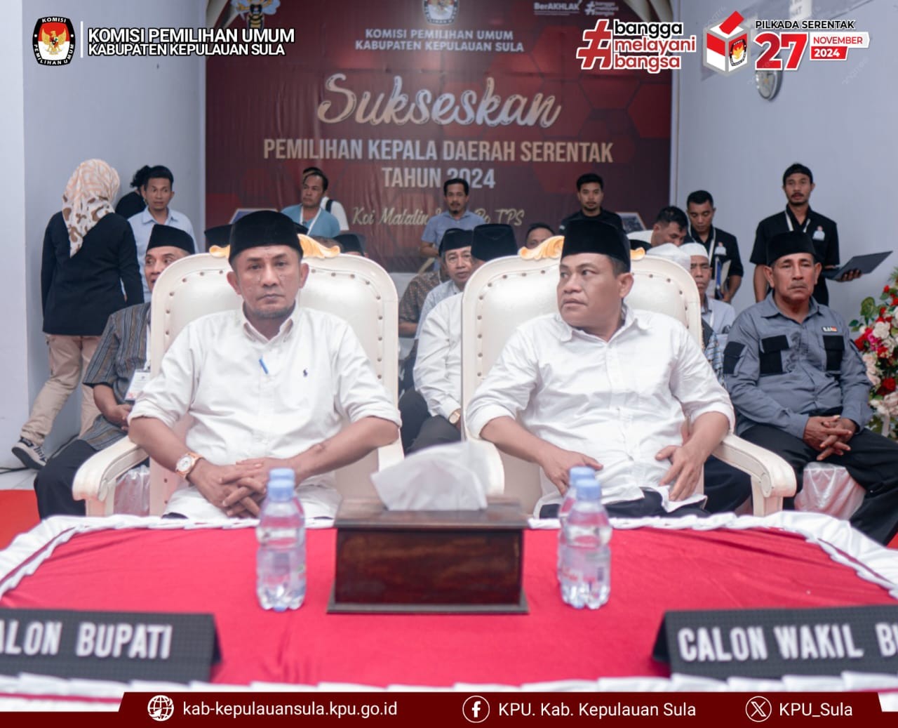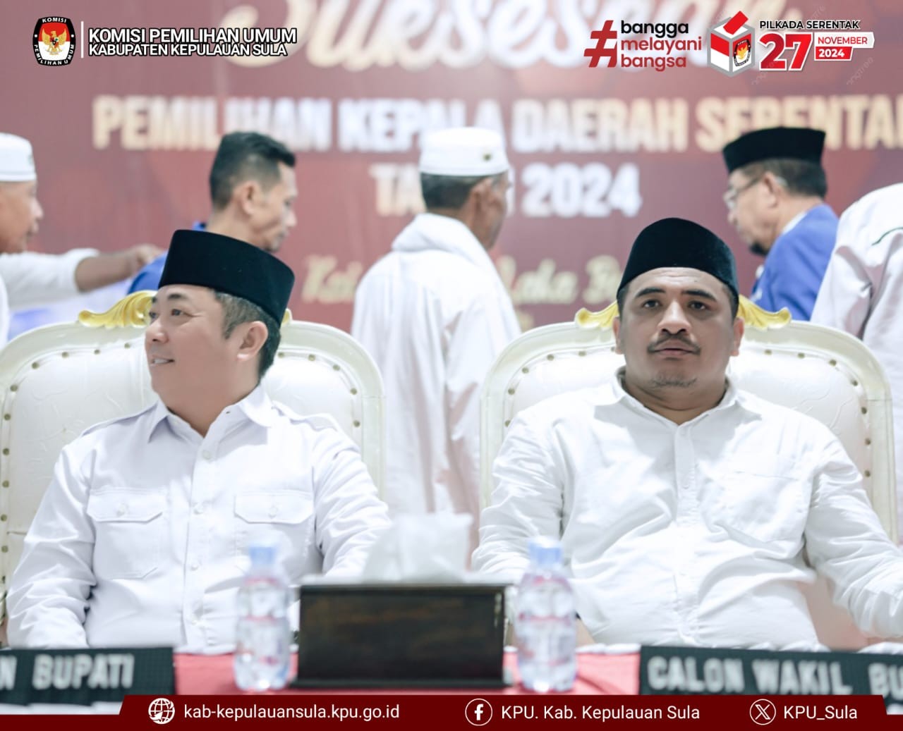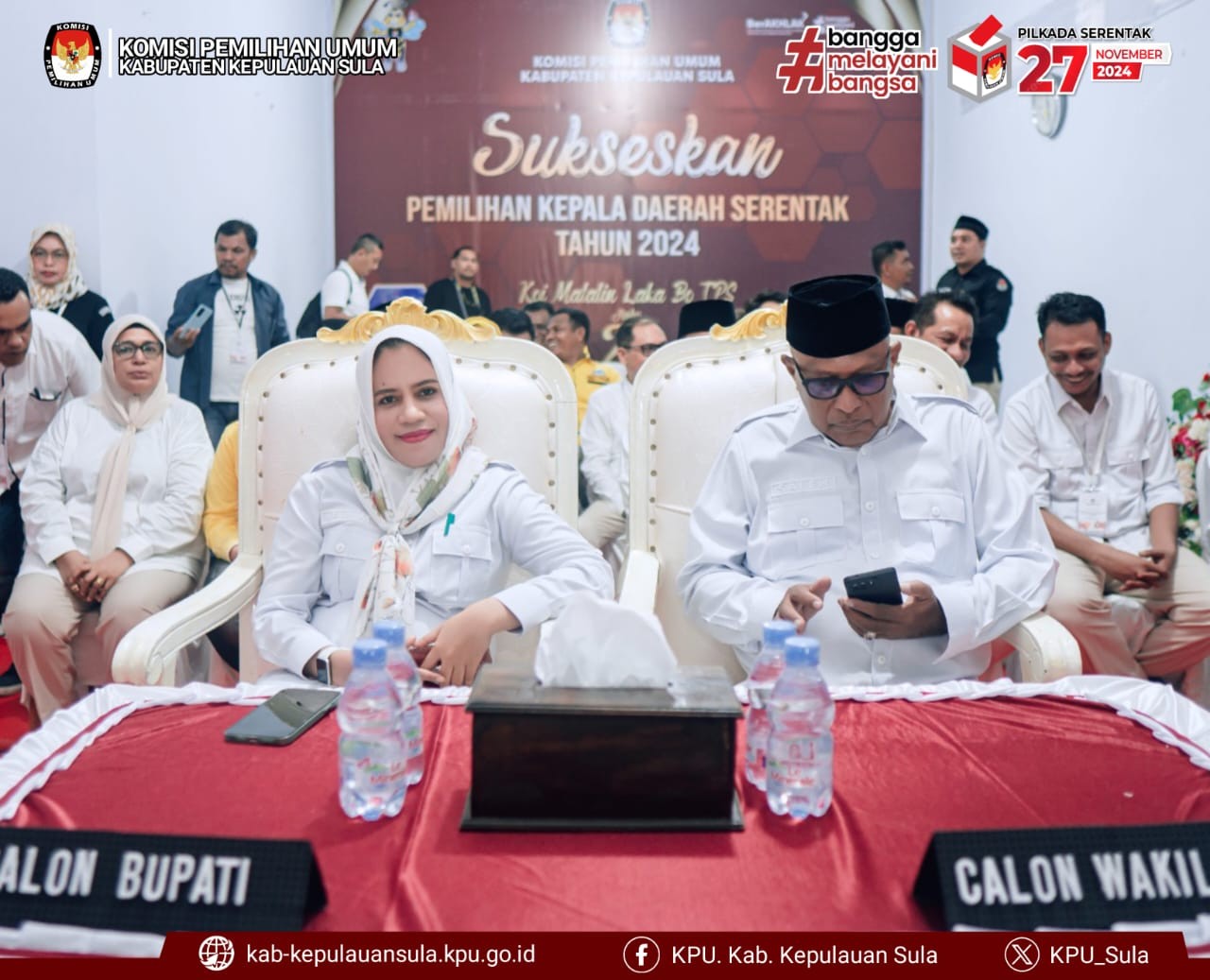 #TemanPemilih, Pasangan Calon Bupati dan Wakil Bupati Kepulauan Sula Hj. Fifian Adeningsi Mus, S.H dan Ir. H.M. Saleh Marasabessy, M.Si yang diusung oleh Partai Golkar, PDI Perjuangan, PKB, PBB, Partai Gerindra, Partai Hanura, PPP, dan PKS dengan akumulasi suarah sah sebanyak 37.922, merupakan Pasangan Calon pendaftar ketiga ke KPU Kabupaten Kepulauan Sula pada pukul 15.48 WIT bertempat di sekretariat KPU Kabupaten Kepulauan Sula, Rabu (28/8/2024).